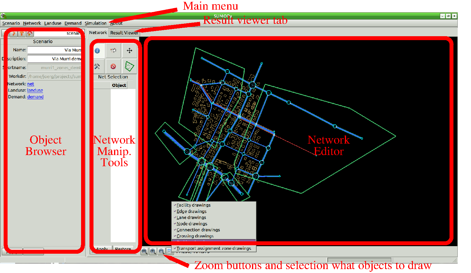 The recommended way to edit the network is via netedit, which is provided with SUMO from version 0.25. SUMO’s netedit can be called by choosing the menu