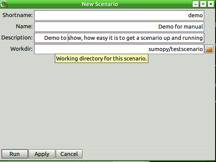 insert the scenario Shortname, and Workdir in the form as shown