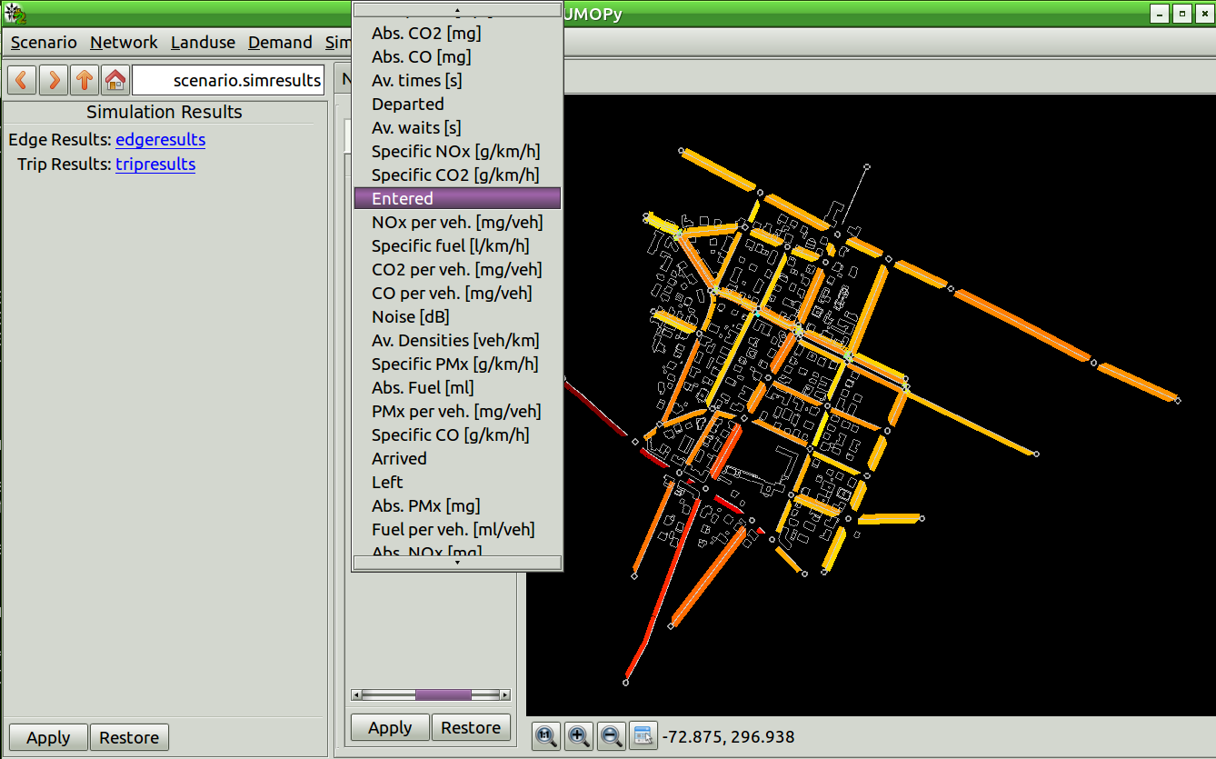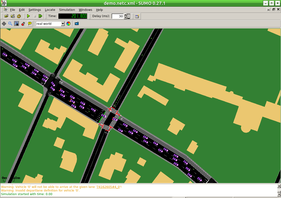 Adjust delay time and press the Start button. At the end of the simulation, confirm OK and close the sumo-gui window. Simulation results are now imported into SUMOPy and are ready to be examined, visualized and exported in various formats.