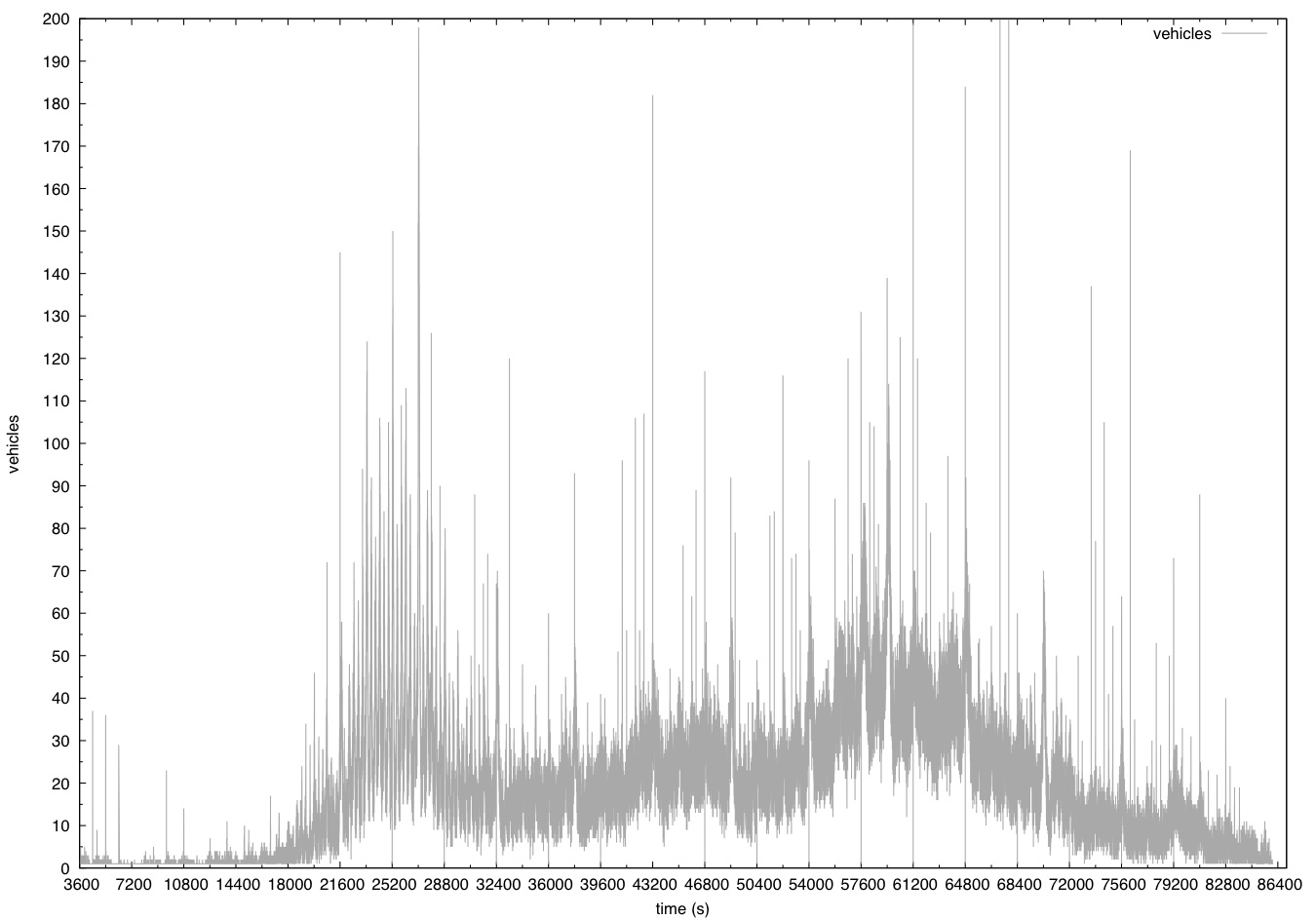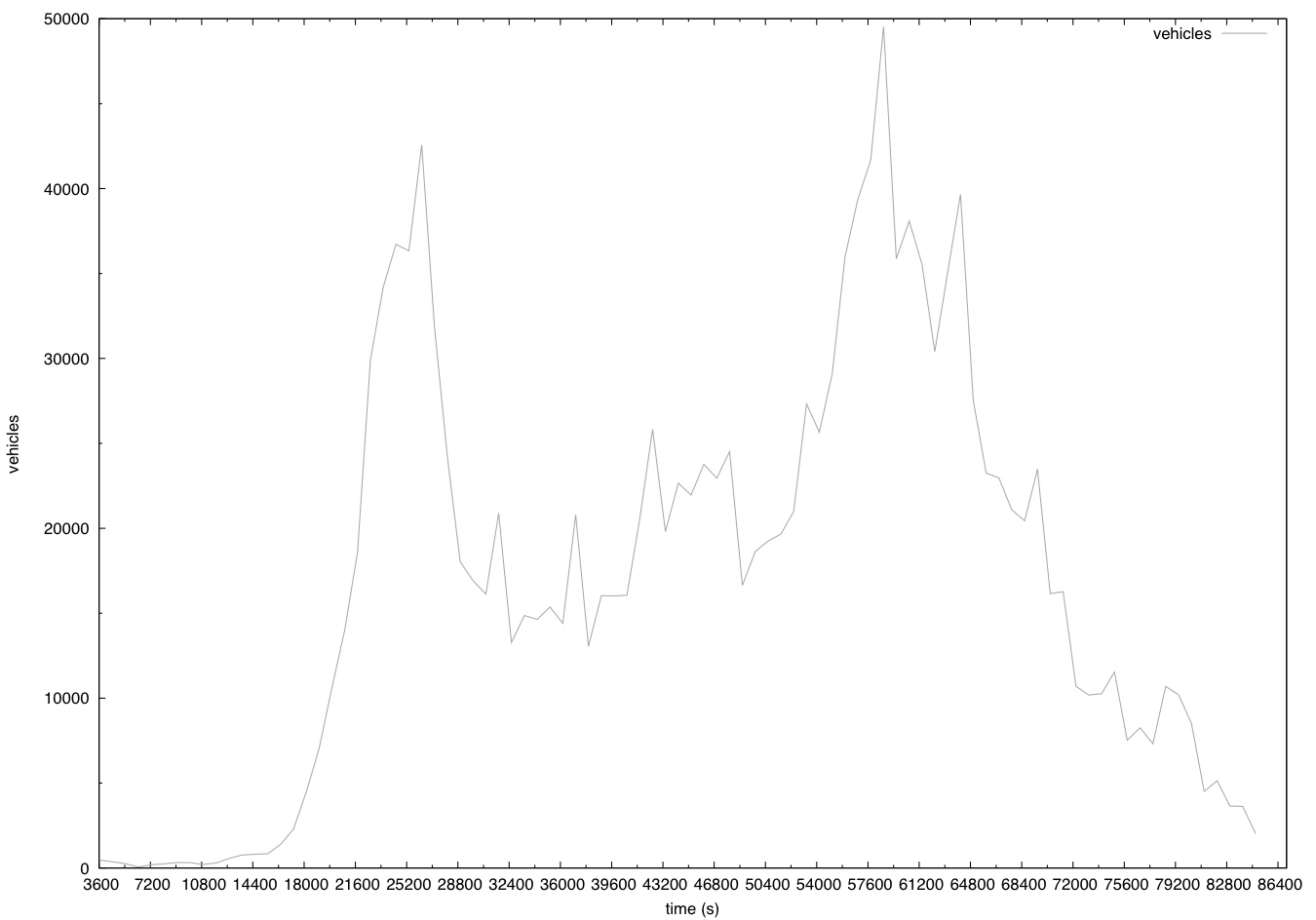 Due to the above problems with the simulation network, the configuration file included with the scenario uses the option --scale 0.3. This reduces the demand to 30% of the realistic value to avoid network-wide traffic jams.