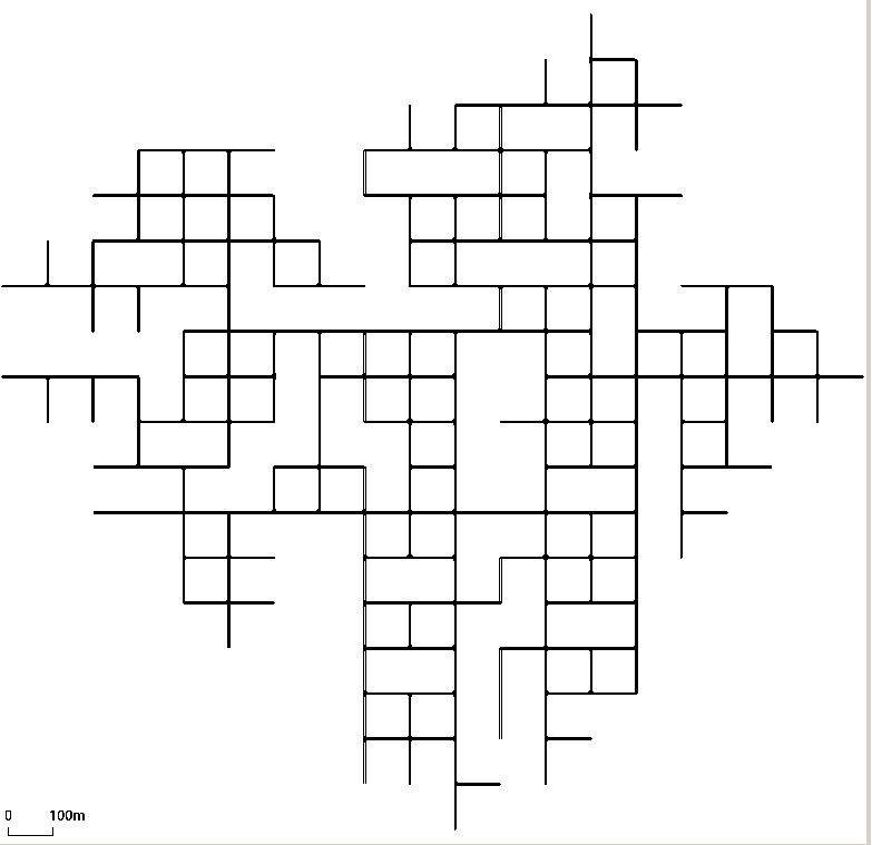 By setting the option --rand.grid, additional grid structure is enforce during random network generation. Newly generated grid nodes, will branch of in cardinal directions from existing nodes at multiples of --rand.min-distance up to a distance of --rand.max-distance. Since new nodes are connected to multiple existing nodes, there will still be edges at arbitrary angles but the basic structure of the network is grid-like.