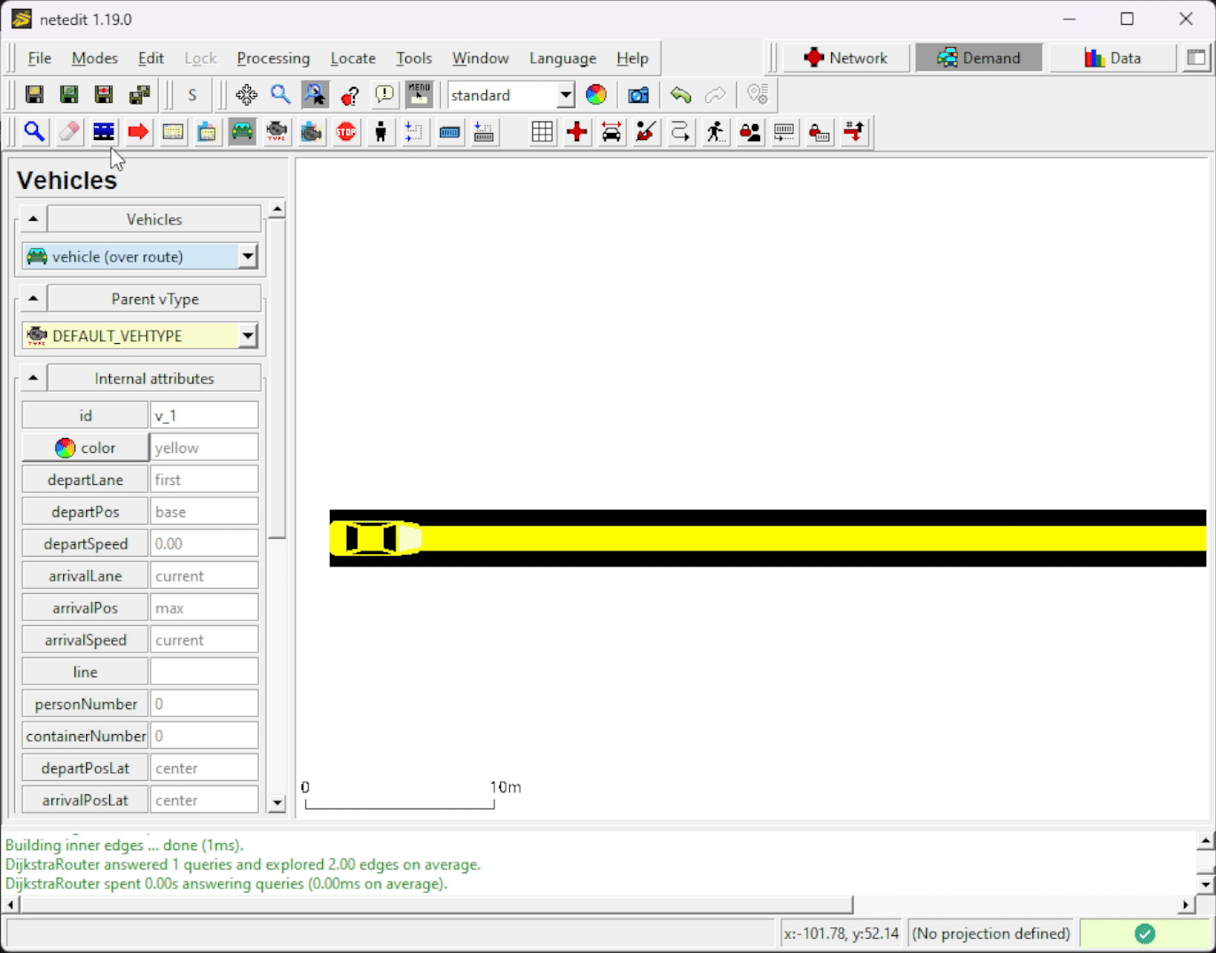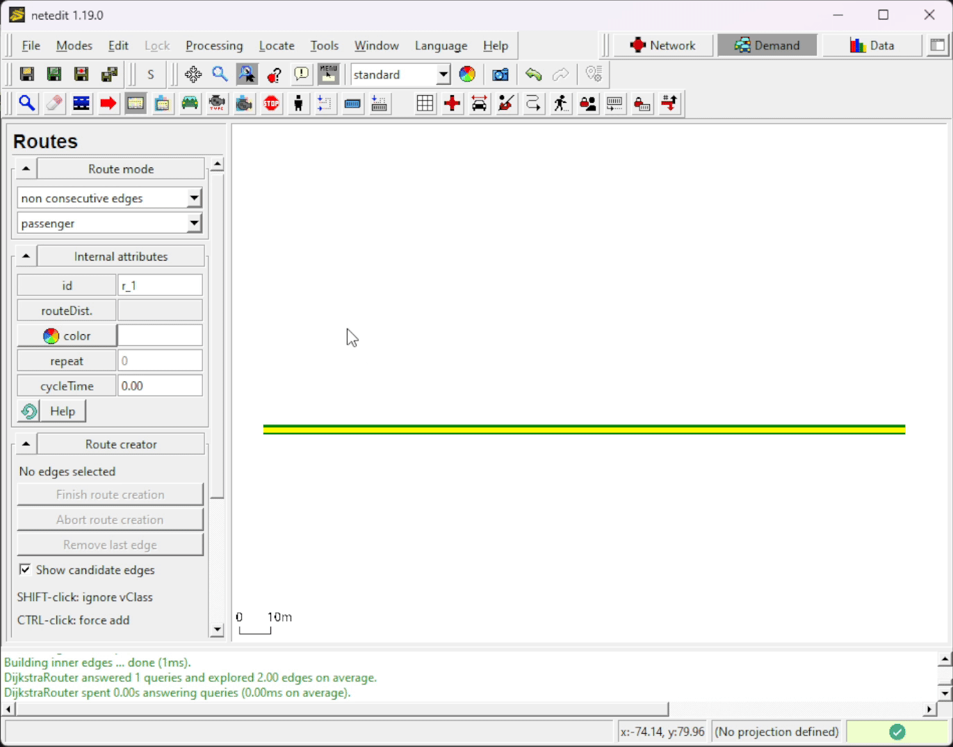 Routes are defined by connecting edges and assigning vehicles that pass through them. In this tutorial we will use netedit to create this.