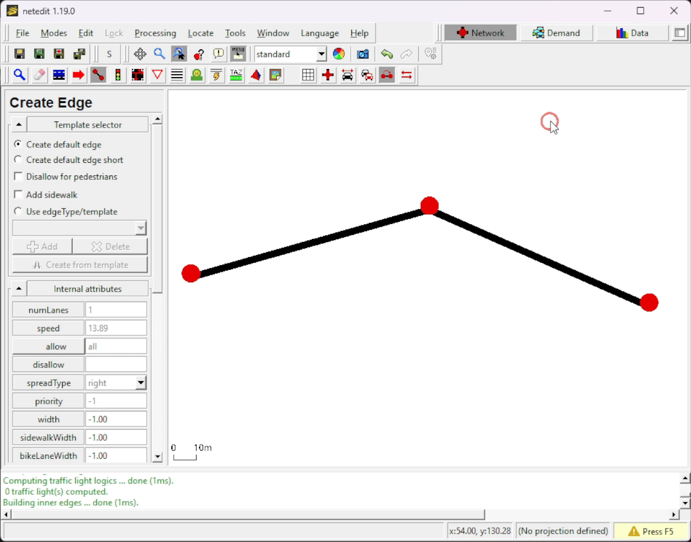 In SUMO a street network consists of nodes (junctions) and edges (streets connecting the junctions). In this tutorial we will use netedit to create our basic net.