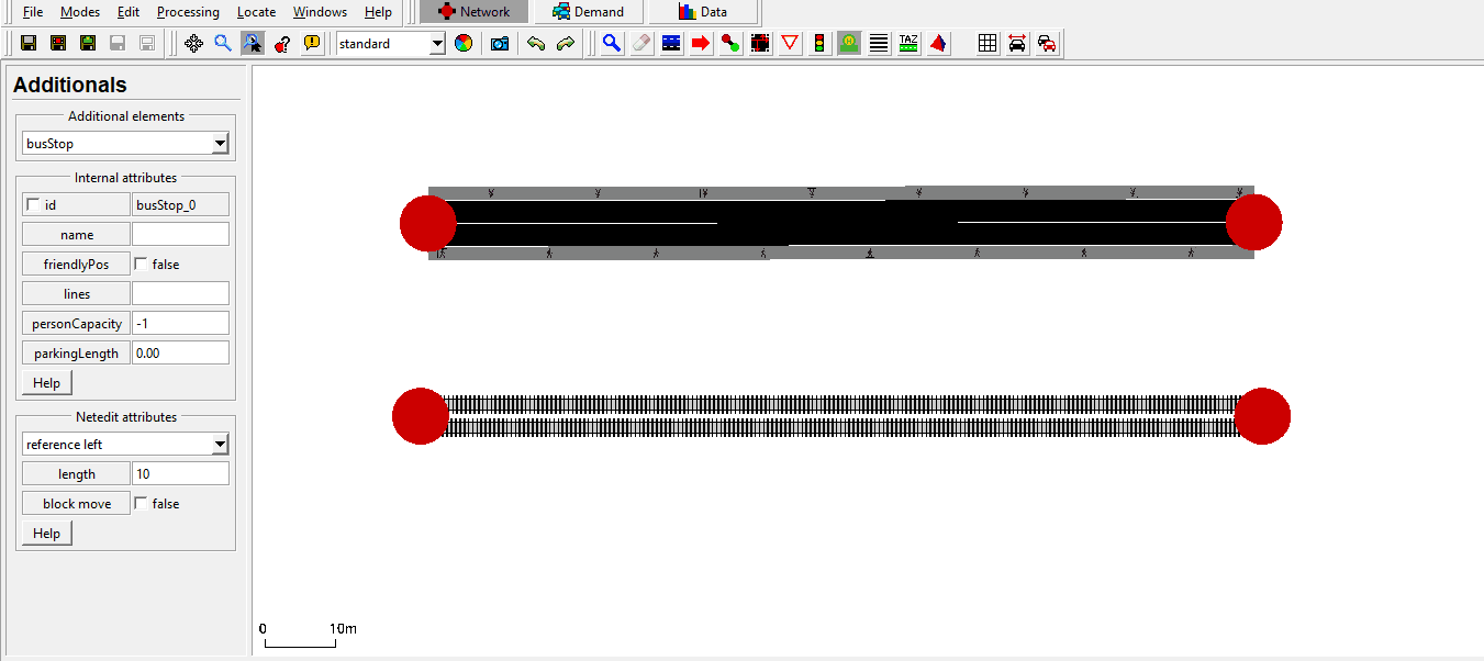 First, the net has to be created and bus stops must be built. There are several ways to accomplish this - one can, for example, write them by hand into the xml file or use netedit for this.
